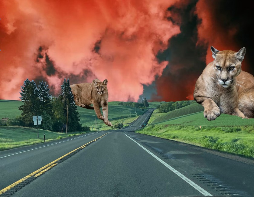 The purpose of this assignment was to use Adobe Photoshop in order to take a once boring image, and create something more interesting. I found this project to be both fun and challenging. My favorite part was messing with the proportions of the cougars, and placing them intentionally on the foreground in order to make the image flow better. One thing I found challenging was the use of contrast and hues to make the back clouds seem more intense. It took me a while to figure out exactly what I was looking for, and I had to try out a bunch of different ideas, but in the end I think it turned out great!